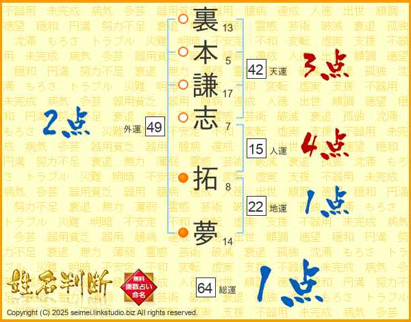 裏(13画)本(5画)謙(17画)志(7画) 拓(8画)夢(14画)