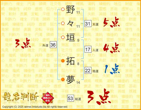 野(11画)々(11画)垣(9画) 拓(8画)夢(14画)