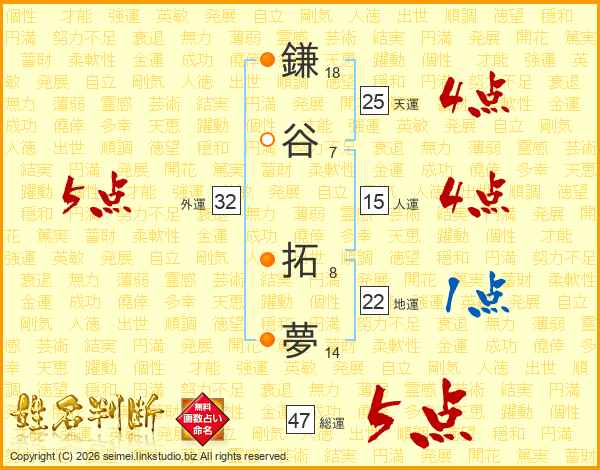 鎌谷拓夢さんの総運は47画の5点!