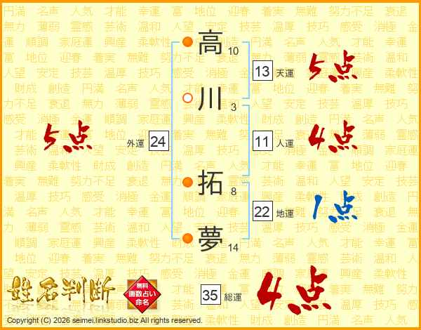 生活面を象徴する運勢です。外部から受ける影響力を表し、結婚運、家庭運や職場、環境への順応性を表します。総運から人運を引いた画数。姓や名が1文字の場合を除く。