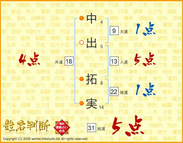 生活面を象徴する運勢です。外部から受ける影響力を表し、結婚運、家庭運や職場、環境への順応性を表します。総運から人運を引いた画数。姓や名が1文字の場合を除く。