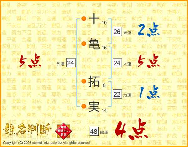 生活面を象徴する運勢です。外部から受ける影響力を表し、結婚運、家庭運や職場、環境への順応性を表します。総運から人運を引いた画数。姓や名が1文字の場合を除く。