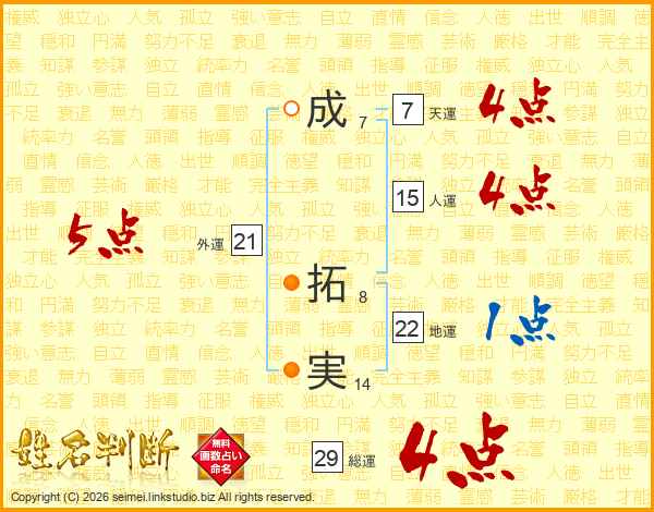 成(7画) 拓(8画)実(14画)