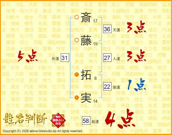 斎(17画)藤(19画) 拓(8画)実(14画)