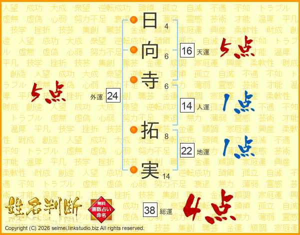 日向寺拓実さんの総運は38画の4点!