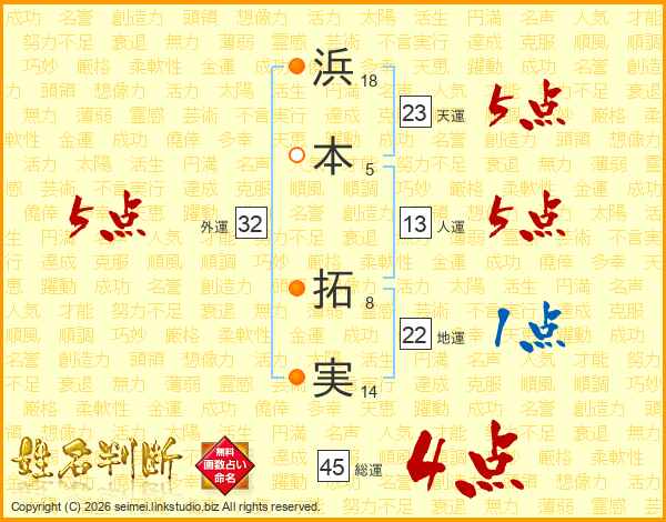 浜本拓実さんの総運は45画の4点!