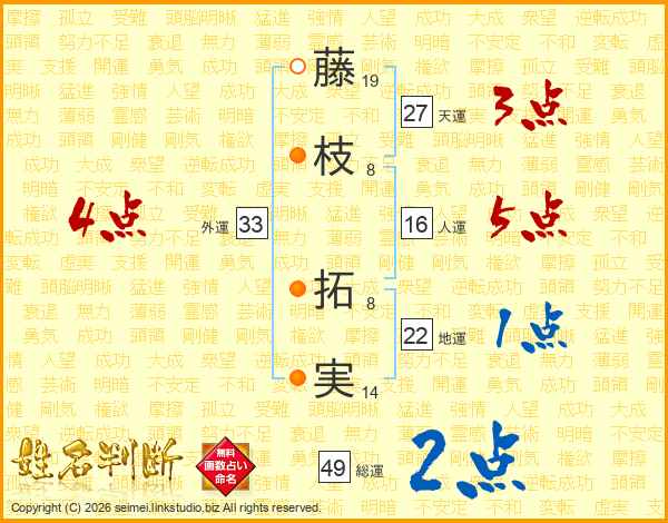藤(19画)枝(8画) 拓(8画)実(14画)