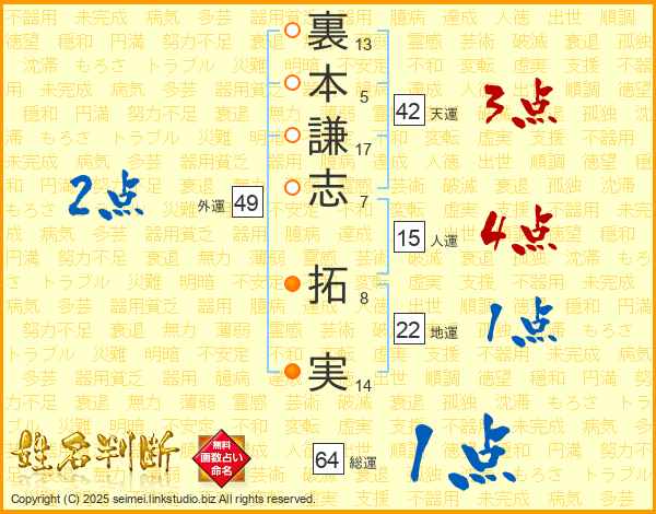 裏(13画)本(5画)謙(17画)志(7画) 拓(8画)実(14画)
