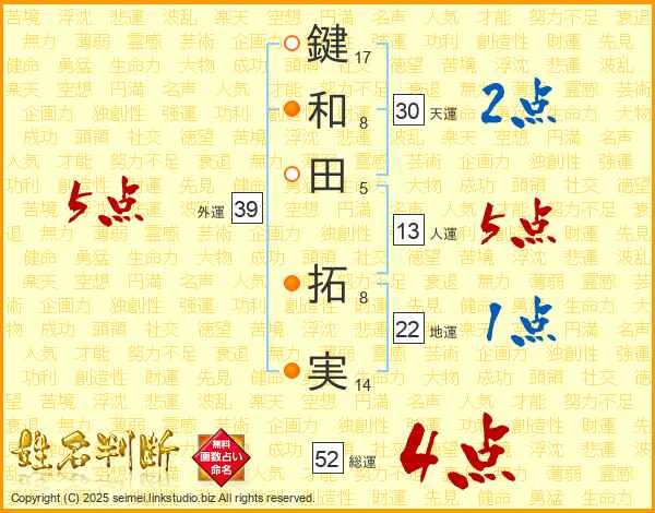 鍵(17画)和(8画)田(5画) 拓(8画)実(14画)