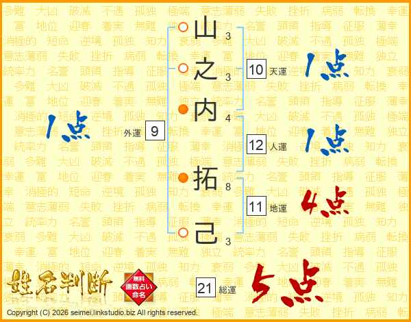山之内拓己さんの総運は21画の5点!