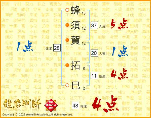 蜂(13画)須(12画)賀(12画) 拓(8画)巳(3画)
