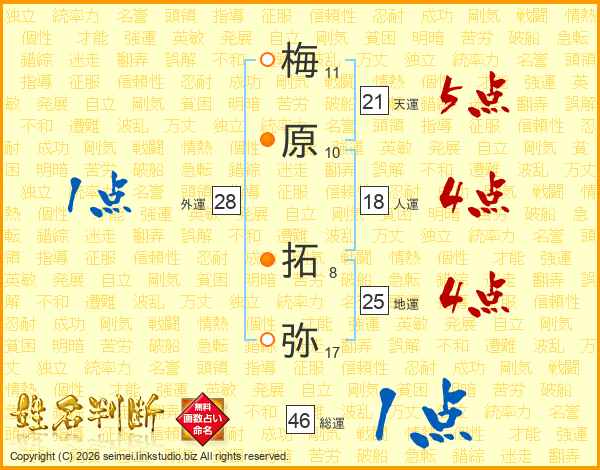 梅原拓弥さんの地運は25画の4点!