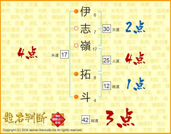 伊(6画)志(7画)嶺(17画) 拓(8画)斗(4画)