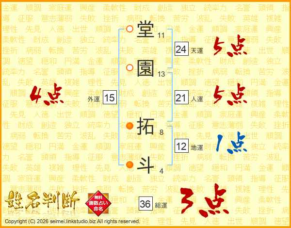 堂(11画)園(13画) 拓(8画)斗(4画)