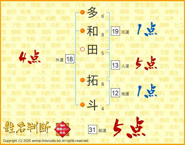 多和田拓斗さんの総運は31画の5点!