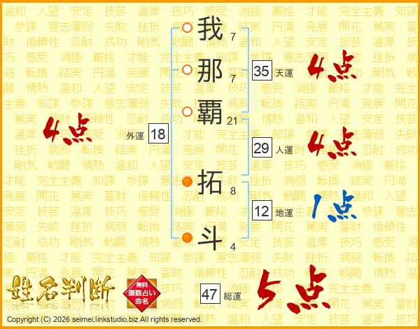 我(7画)那(7画)覇(21画) 拓(8画)斗(4画)