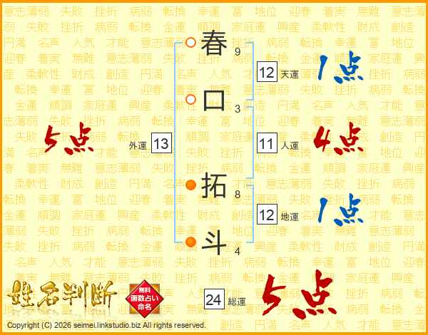 春口拓斗さんの総運は24画の5点!
