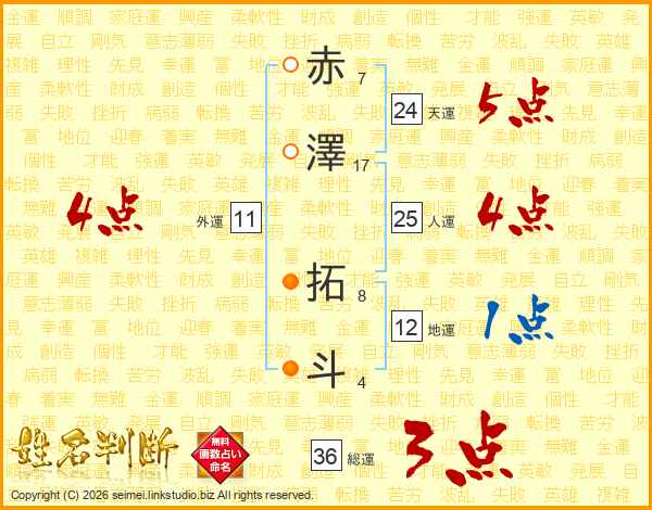 赤(7画)澤(17画) 拓(8画)斗(4画)