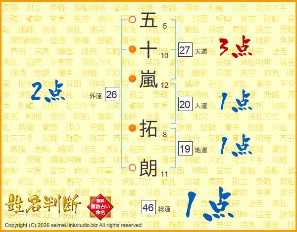五(5画)十(10画)嵐(12画) 拓(8画)朗(11画)