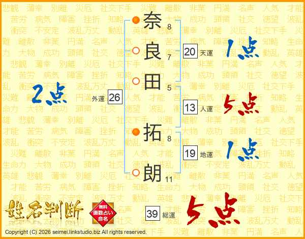 奈(8画)良(7画)田(5画) 拓(8画)朗(11画)