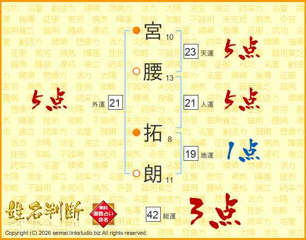 宮(10画)腰(13画) 拓(8画)朗(11画)