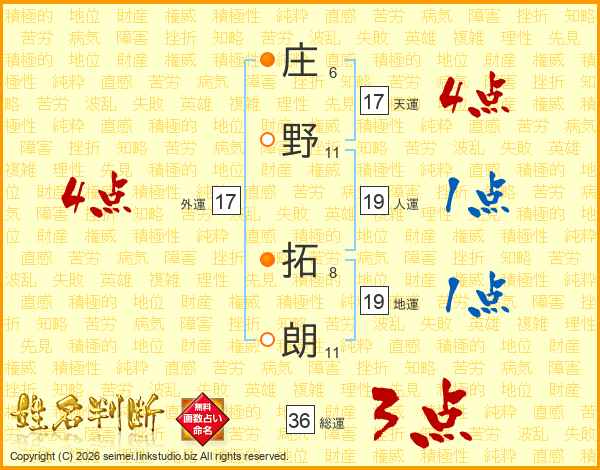 庄(6画)野(11画) 拓(8画)朗(11画)