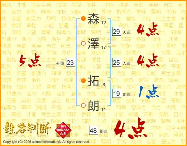 森(12画)澤(17画) 拓(8画)朗(11画)