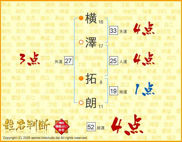 横(16画)澤(17画) 拓(8画)朗(11画)