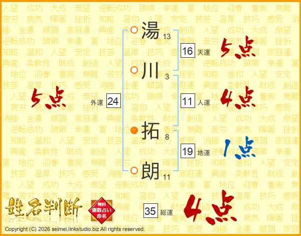 湯(13画)川(3画) 拓(8画)朗(11画)
