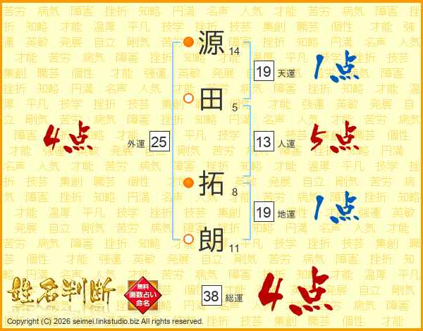 あなたの人生を表す1番重要な運勢です。生涯を通じて影響する総合運となり、主に50歳以降の晩年期に影響を及ぼします。苗字と名前の合計画数。