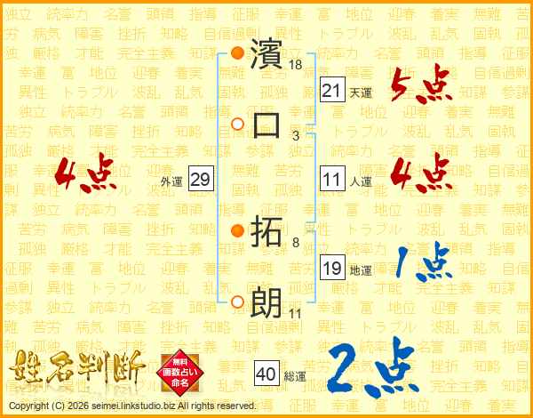 濱(18画)口(3画) 拓(8画)朗(11画)