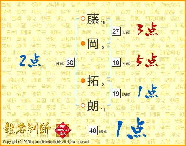 藤岡拓朗さんの天運は27画の3点!