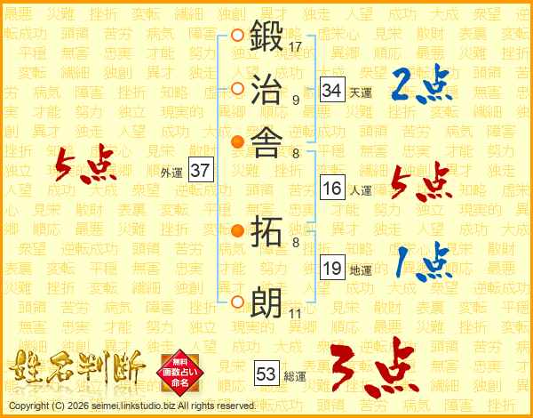鍛(17画)治(9画)舎(8画) 拓(8画)朗(11画)
