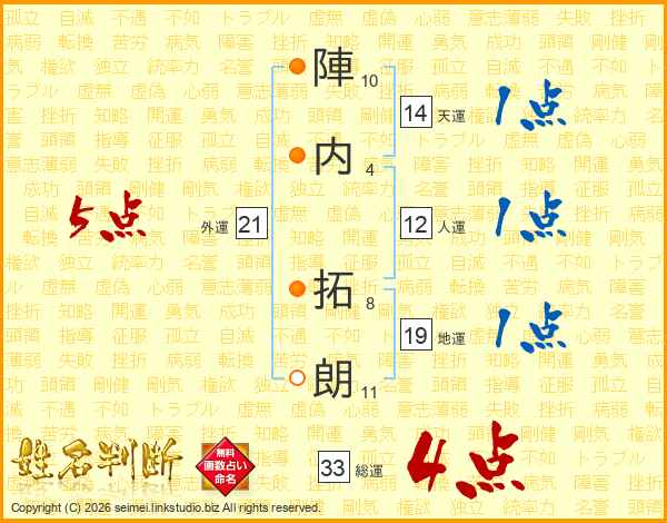 陣(10画)内(4画) 拓(8画)朗(11画)