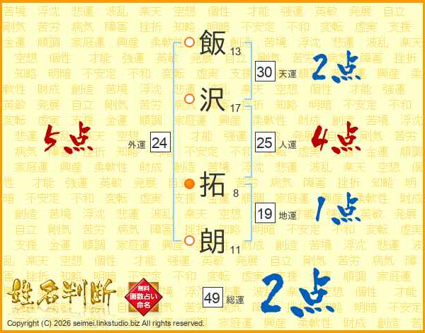 飯沢拓朗さんの総運は49画の2点!