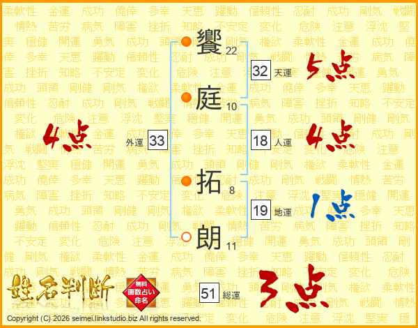 饗(22画)庭(10画) 拓(8画)朗(11画)