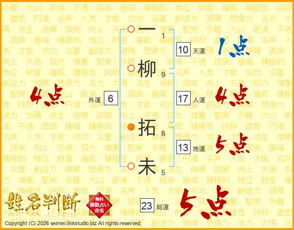 生活面を象徴する運勢です。外部から受ける影響力を表し、結婚運、家庭運や職場、環境への順応性を表します。総運から人運を引いた画数。姓や名が1文字の場合を除く。