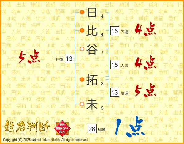 日(4画)比(4画)谷(7画) 拓(8画)未(5画)
