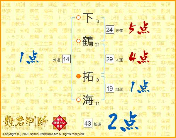 下鶴拓海さんの天運は24画の5点!