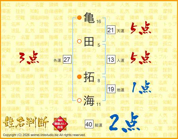 亀田拓海さんの天運は21画の5点!