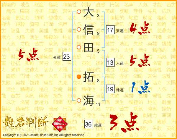 大(3画)信(9画)田(5画) 拓(8画)海(11画)