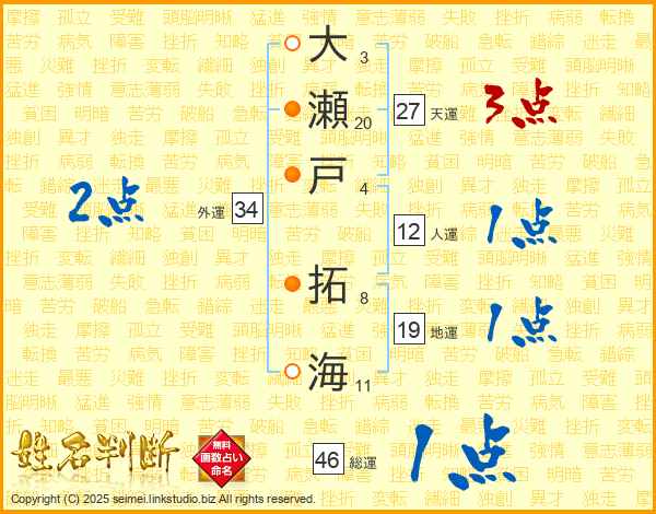 大(3画)瀬(20画)戸(4画) 拓(8画)海(11画)