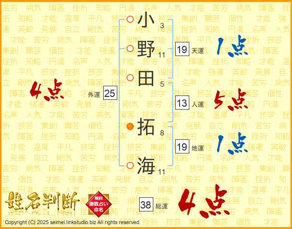 小(3画)野(11画)田(5画) 拓(8画)海(11画)