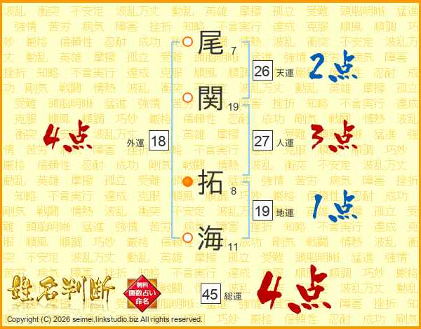 あなたの人生を表す1番重要な運勢です。生涯を通じて影響する総合運となり、主に50歳以降の晩年期に影響を及ぼします。苗字と名前の合計画数。