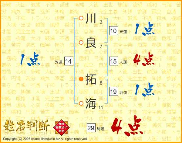 生活面を象徴する運勢です。外部から受ける影響力を表し、結婚運、家庭運や職場、環境への順応性を表します。総運から人運を引いた画数。姓や名が1文字の場合を除く。