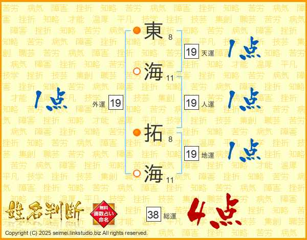 生活面を象徴する運勢です。外部から受ける影響力を表し、結婚運、家庭運や職場、環境への順応性を表します。総運から人運を引いた画数。姓や名が1文字の場合を除く。