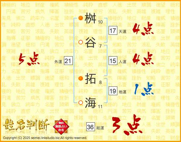 桝(10画)谷(7画) 拓(8画)海(11画)