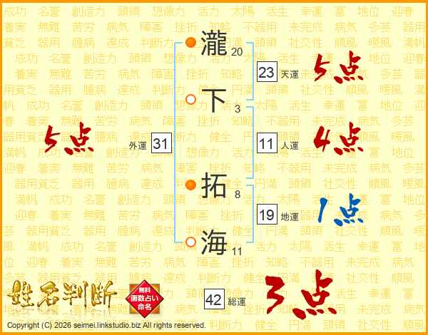 瀧(20画)下(3画) 拓(8画)海(11画)