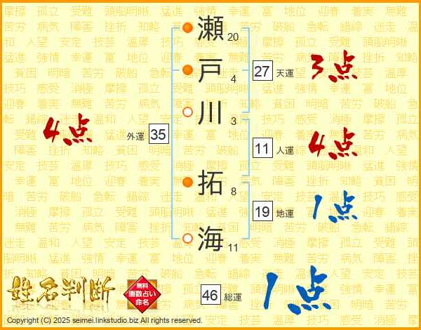 瀬(20画)戸(4画)川(3画) 拓(8画)海(11画)