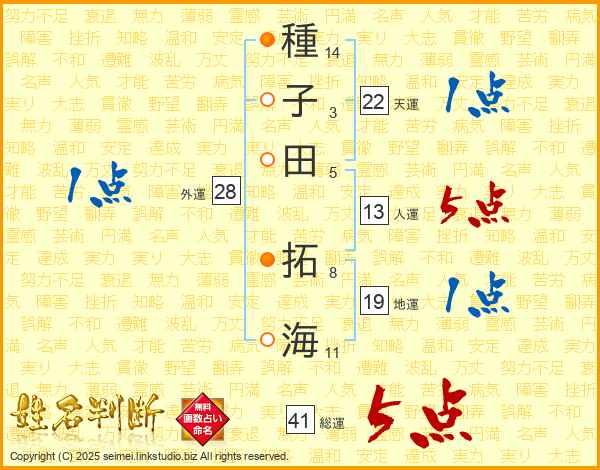 種(14画)子(3画)田(5画) 拓(8画)海(11画)